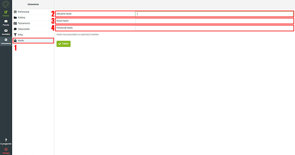 - aktualne hasło (nr 2 na rys. poniżej) - w tym miejscu wpisujemy bieżące hasło dostępu do skrzynki pocztowej
