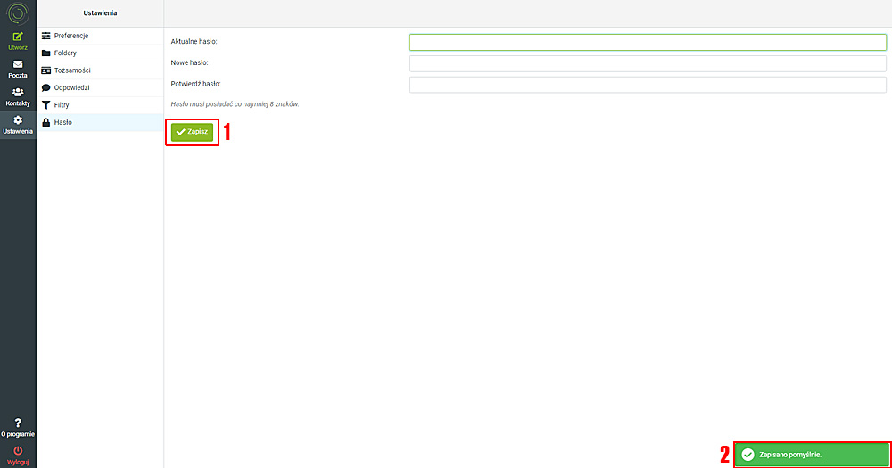 Na koniec klikamy przycisk "Zapisz" (nr 1 na rys. poniżej) i jak wszystko przebiegnie pomyślnie, w miejscu oznaczonym numerem 2 na poniższym rysunku, pojawi się komunikat o pomyślnej zmianie. W wypadku niepowodzenia, w tym samym miejscu, pojawi się komunikat z błędem informującym nas, co zostało źle zrobione.