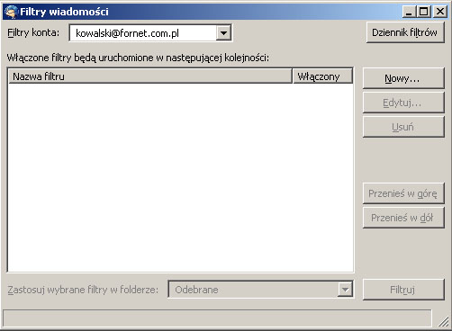 Po wybraniu tej opcji pokaże nam się okno w którym będzie lista filtrów (w tym przypadku puste ponieważ nie definiowaliśmy wcześniej żadnych) oraz będą z nim przyciski które pozwolą na dodanie, edycję bądź usuwanie filtrów. Aby stworzyć nowy filtr należy kliknąć przycisk "Nowy...".