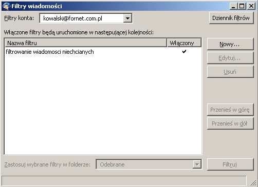 Po zakończeniu konfiguracji widzimy w oknie z listą naszych filtrów do danego konta nasz świeżo stworzony filtr. Od momentu kiedy zamkniemy to okno filtr zacznie działać.